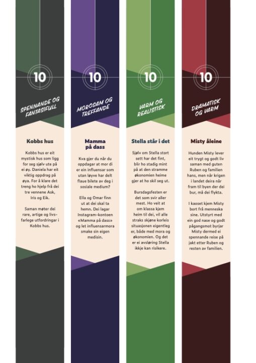 Her kan de laste ned bokstriper som de kan bruke rundt dei ti utvalde bøkene – i ei utstilling i klasserommet eller på skulebiblioteket.