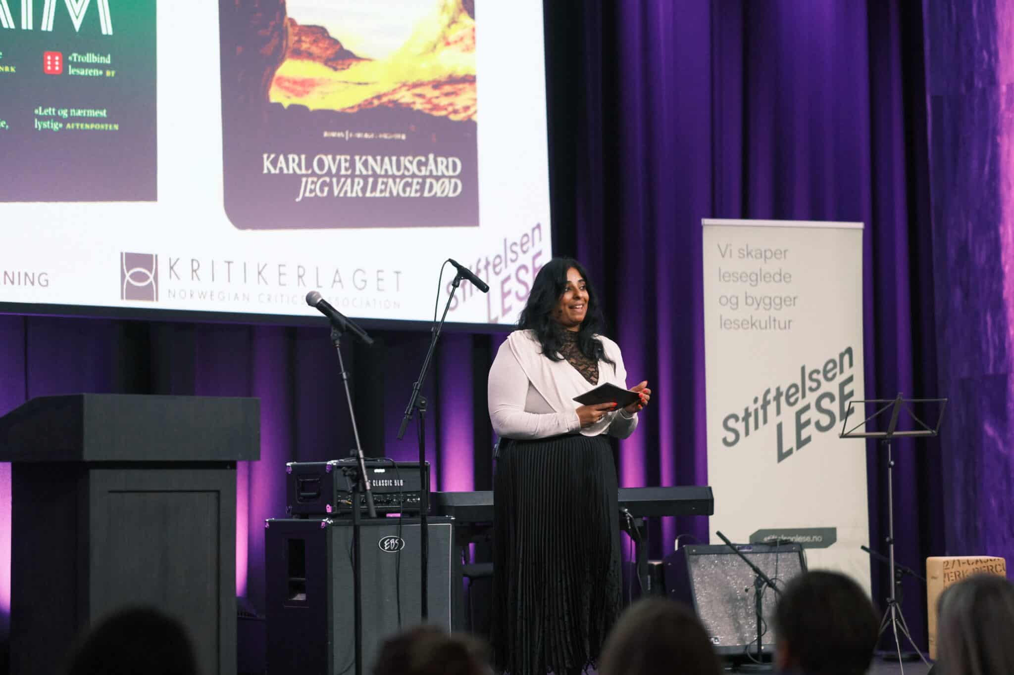– Som dere ser er ikke Karl Ove Knausgård her i dag selv, han er på reise. Kjersti Instefjord fra Oktober, redaktøren til Karl Ove tok imot prisen for ham på scenen. – På vegne av forlaget og forfatteren vil jeg si tusen, tusen takk for Ungdommens kritikerpris. Kanskje den viktigste prisen i Norge.