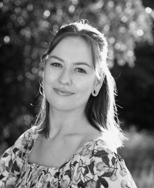 Henriette Tomter Osnes (f. 1990) er illustratør og grafisk designer, og jobber også som veggmaler. Hun er også utdannet barnehagelærer. Une og skolestarten er hennes første utgivelse for barn. Hun har også illustrert en bok om ordene vi bruker: Ordenes hårreisende hemmeligheter skrevet av Ragnhild Holmås (Aschehoug 2023). Foto: Julie Pike